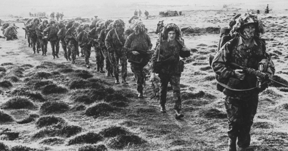 British forces advancing across the Falkland Islands ahead of battle (Image: Getty)
