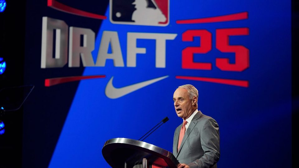 MLB Commissioner Rob Manfred speaks during the first round of the MLB baseball draft Sunday, July, 13, 2025, in Atlanta, Georgia. (AP Photo/Mike Stewart)